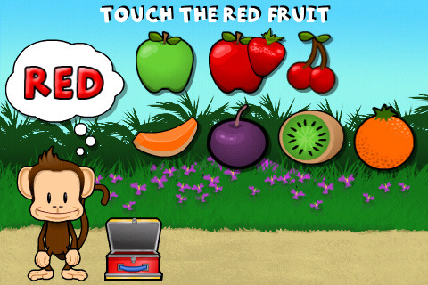 1. COLORS. This picky monkey only likes fruit of a certain color, touch only the color they like to pack the lunchbox. Teaches colors, color names, and grouping.