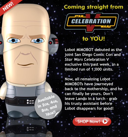 Received an email today from Mimoco that states that the once Star Wars Celebration V exclusive, the Lobot MIMOBOT is now available in very minimal quantities online while supplies last. They are still available in 2GB, 4GB, 8GB and 16GB units starting at $39.95.