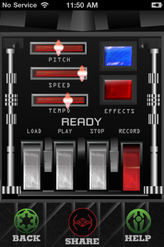 The robust controls of the application will help you hone in on your inner Dark Side with adjustable settings for Pitch, Speed, and Tempo. Add various Vader breathing sounds to your recordings to really step it up a notch.