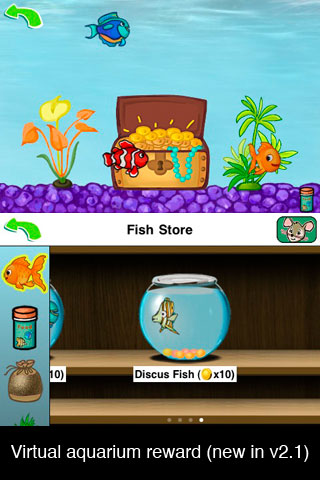 TeachMe: Kindergarten has a reward based system based on coins and rewards. For every few questions that my son gets correct, he is awarded a gold coin. If he saves up enough gold coins, he can purchase items for his aquarium. This includes fish, gravel, decorations, food, etc. So basically, my son has been playing Teach Me Kindergarten so that he can fill and decorate his aquarium with every item available for purchase. Not a bad way to get a child motivated to play.