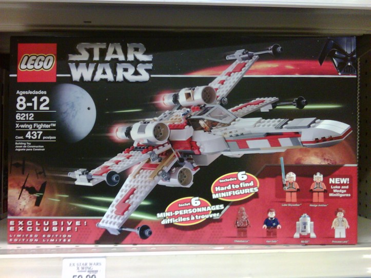 Next up are the LEGOs. I love LEGOs. I love the fact that with a LEGO set, you can basically build almost anything your imagination can think of as long as you have all the proper pieces. I had LEGOs as a child but I never had any LEGO sets like these. Toys R Us is literally stocked to the brim with all kinds of Star Wars LEGO sets which if I had the money, I would buy each and every single on of them. The X-Wing Fighter is probably my favorite of the bunch and also comes with 6 mini-figs.