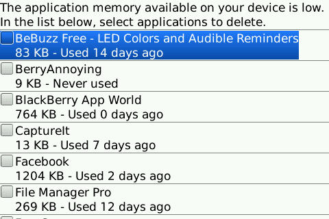 So this is the first time I’ve ever seen this screen pop up on my BlackBerry. Even though I know I have well over 21 MB of available application memory free. This means that my BlackBerry most likely has a memory leak and it’s coming from a recently installed app or update. Time to go digging around.