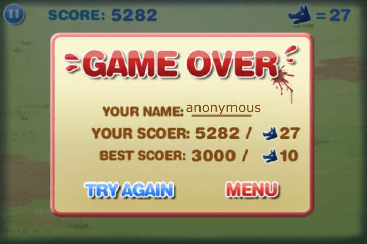 Vertra’s Hunter and Wolves could have been a fun game except that there is just very little to really do in it. The graphics are poor and the gameplay is too simplistic and repetitive. I would have much rather seen in game graphics that matched those of what are in the story animations. Also the misspelling on the word SCORE is just unforgivable considering it is displayed so largely on the screen. In the end, I honestly feel like I wasted my few minutes playing this game even though it was free to download. If it were a paid app, I would have been really upset. I recommend you skip this game and run for the hills like you were being chased by a pack of wolves.