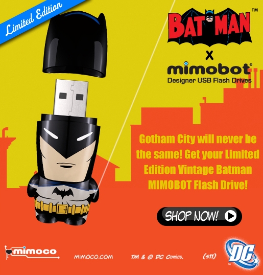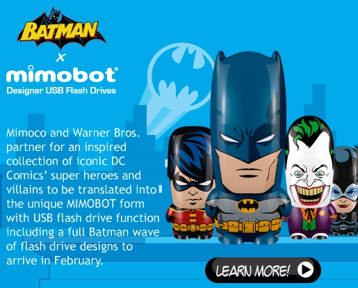 Looks like Mimoco is expanding their line of MIMOBOT designer USB Flash drives as they are now collaborating with Warner Bros. for an exclusive line of Batman related MIMOBOTs. This is great news as I was a big fan of their Star Wars line of MIMOBOTs and the Batman themed ones look like they are going to be just as awesome. The full line of Batman inspired MIMOBOTs will be available come this February. You can purchase the limited edition Vintage Batman MIMOBOT now in their store however here. The Vintage Batman is limited to 5000 pieces.