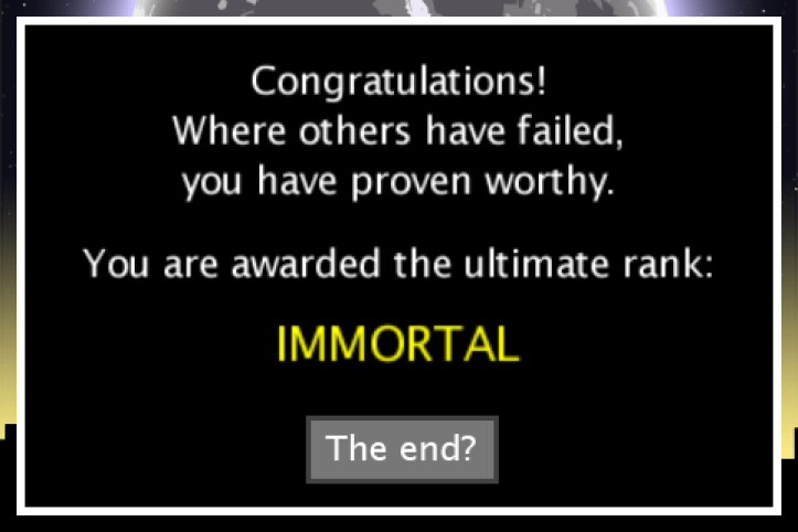 One Single Life is a very unique game that really messes with your mind. One one hand, the gameplay itself isn’t that difficult. It’s the fact that you only get one life to play the entire game which makes you question your skill. It took me 2 days to finally finish the game and that was because I kept playing the practice levels over and over again just to make sure I would make it on the real run. Even then, I would hold back sometimes just to practice again. I did finally reach level 10, passed it, and was awarded the ultimate rank of IMMORTAL, but is it really the end of the game? hmm…