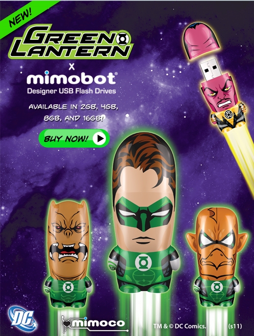 (BOSTON – May 17, 2011) — Mimoco, creator of the MIMOBOT® line of designer USB flash drives, and Warner Bros. Consumer Products on behalf of DC Entertainment, the world’s largest publisher of comic books, introduce the Green Lantern wave of MIMOBOT flash drive designs. The new collection consists of favorites from the Green Lantern Corps including Hal Jordan, Tomar-Re, Kilowog and Sinestro.
