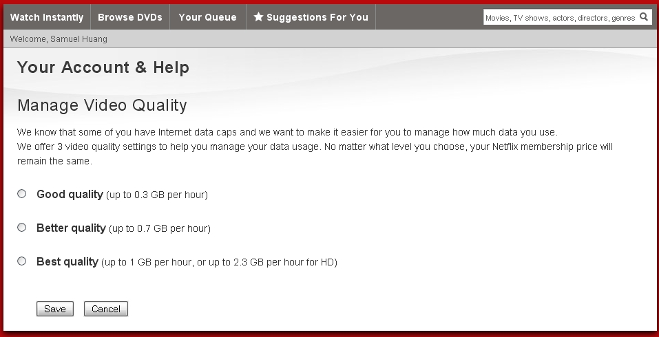 I believe this was only offered in Canada before, but now Netflix offers it’s US subscribers a way of managing their video quality settings. This is especially useful to those who currently have data caps with their internet service provider. You can reach these settings from your account page here. There are three different options to choose from depending on your needs.