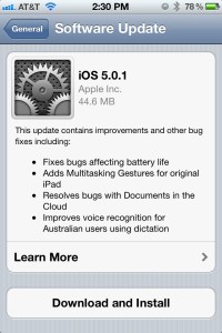 First of all, your iOS device is not going to tell you there is an update. You soft of just need to know there is one, like right now. As I’m writing this, there is a new update, iOS 5.0.1 out and it’s the first to make use of OTA updates. As opposed to the 700mb+ file you’d need to download from iTunes, this one was only about 45mb.