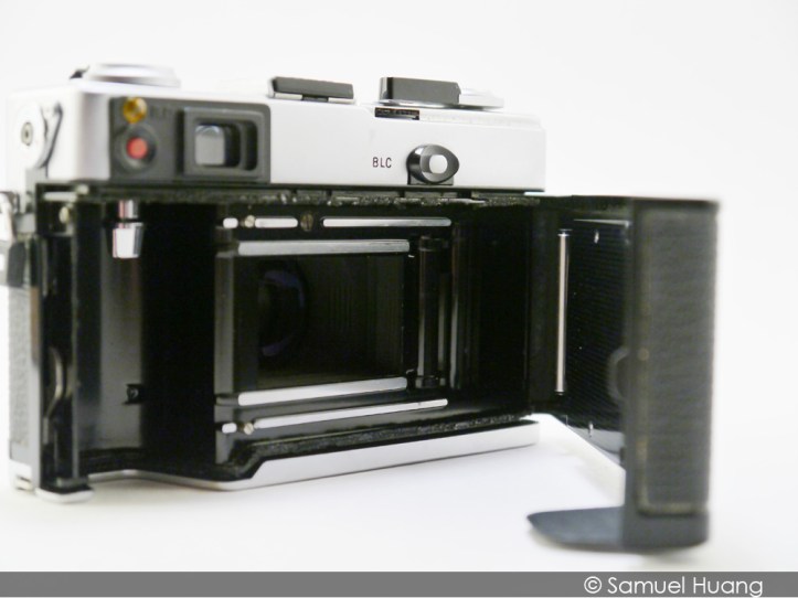 Here’s a nice shot of the interior of the Olympus 35 DC. I remember how careful you had to be back then to unroll the film and to make sure that when you were done shooting, to wind the film back up again before popping the door back open. I have no idea what that “BLC” button is for.