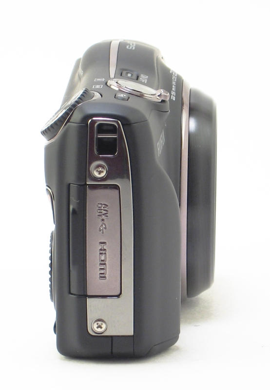 Rotating clockwise once again, this side of the camera is dominated by the terminal cover which is made of a hard plastic/rubber that seems to be pretty durable. It blends in nicely with the side of the camera and has a nice lip on it that makes it easy to open the cover up. Underneath the cover is a combination A/V and USB port as well as an HDMI port. Above the terminal cover is the strap eyelit which is deep and recessed. It might be a bit difficult for some to loop their wrist strap to this but once it’s in, it’s even harder to take off.  You can see from the angle too the generous thumb grip and finger grip which like I said above, makes the camera very comfortable to hold.