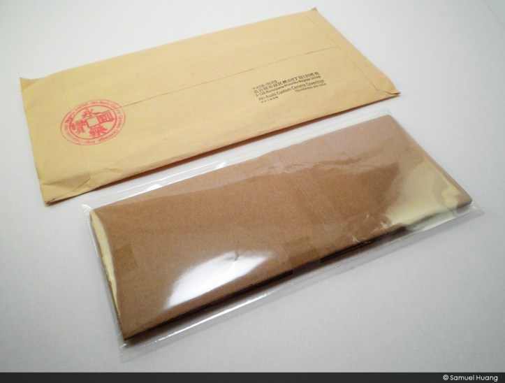 The package from Aki-Asahi only took about a week and a half to get to me. It came in a plain envelope but stamped with the company seal as well as company information. It was actualyl a pretty neat envelope as it had a ton of stamps on the other side, but I’m not going to show that as it has my address on it. When you feel the envelope for the first time, it feels a bit thick and real stiff. You’ll see why.