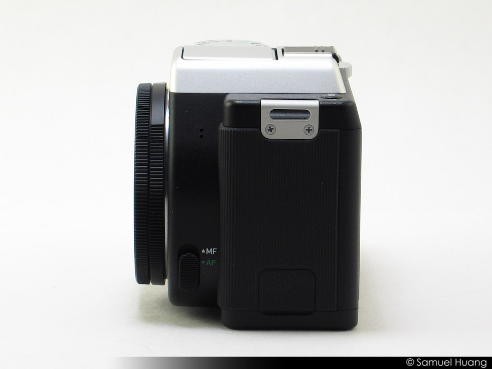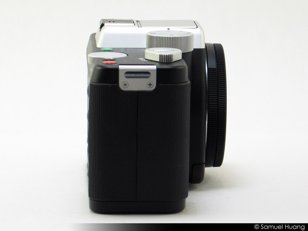 Rotating the camera clockwise again, we can get a view of the other side of the K-01. Again like the other side, it basically wrapped in the same rubber grip material that we see on the front. What’s interesting here is that you’d be hard pressed to tell that there was anything here at all except for the metal leash eyelit up top. In fact, there is a rubber hidden door here. On the left, if you lift up the grip, the door pops open which is made out of the same material as the grip. The door itself feel a bit flimsy and sometimes hard to close back up properly, but I do appreciate the stealthiness of it. Under the door, you’ll find another door, plastic this time, that covers up the opening for the SDHC card. You’ll also find an HDMI port and a combo PC/AV port. Again like I’ve stated in other reviews, I really like when the SDHC slot is located on the side instead of at the bottom because it allows for easy access to your memory card. When it’s placed at the bottom, sometimes it’s very difficult to get at if you have a tripod mount attached.
