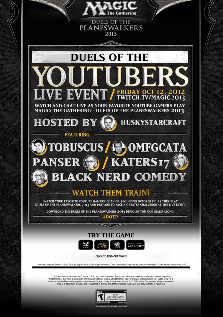 I’m going to just assume that many of you have heard of Magic: The Gathering and have maybe even played it in the past. It was a hugely popular card game when I was growing up and it looks like people still play it in one form or another. Magic: The Gathering Duels of the Planeswalkers 2013 is out now for PC, Xbox 360, and PS3 as well as on iOS. To celebrate its release, 6 of the most popular YouTube gamers will be battling it out live, Friday, October 12th over at Twitch.TV/Magic2013. For more details on the event and who is competing, visit the Facebook page for more details: http://bit.ly/DuelsoftheYouTubers