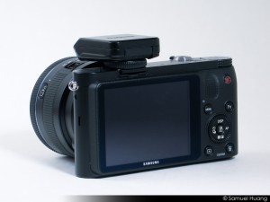 On the top of the NX1000, you’ll find that it’s pretty minimal up here. There is a large control dial, which I love and favor over having to select modes through the software. There is also the shutter release button which is surrounded by an on/off toggle. The last button you’ll find is the SMART Link button which is used to connect to SMART enabled devices and apps in order to transfer photos wirelessly. More on that later. The last item of interest here is that Samsung smartly chose to use a standard hotshoe instead of a proprietary one. This means that it will be able to take most current aftermarket flash units. I ended up just leaving the optional flash installed through my time with the NX1000 as I think most people may end up doing as well.