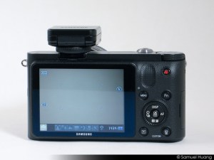 The front of the camera is very simple looking, like most of the other Samsung cameras. It’s very clean and minimal with the only breaks on the surface being the many logos. Again, there is a prominent grip but it doesn’t protrude out as much as the Sony NEX-5N that I have. It is also textured to look like leather, but it’s not. It’s just plastic. On the top right corner of the grip you’ll find an AF-assist light. I’m not sure if I like the positioning of this as it seems too easy for my finger to block it if I’m holding it a certain way. The only other thing on the front of the camera is the lens mount which again, looks a bit plastic-like from the outside. This could also be because of the matte-black color, which is the one I have here. It might have a different feeling in white, but I wouldn’t know as I haven’t seen it in that color yet.