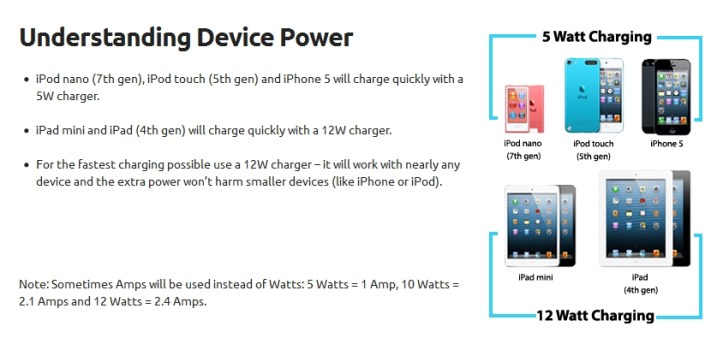 Here’s a little chart that quickly sums up what kind of charger you need to for your various iOS powered devices. It’s for lightning port equipped Apple devices, although the chart remains true for even the old 30 pin devices. Basically if you have and iPhone and iPad, you’re better off going straight for a 12 watt charger as these will work for all iOS devices. If you get a 5 watt charger, it can still charge an iPad, but just very slowly. When I travel, I usually only take my iPad charger that it came with because this is a 12 watt charger and can handle pretty much all my USB powered devices even if it’s not an iOS device. I keep the tiny 5 watt charger at home.