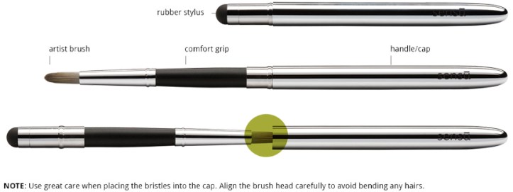 If you’ve never seen the Sensū Brush and Stylus before, you’re missing out on one really slick combo stylus. When you first get the Sensū, it just looks like an ordinary metal stylus with a rubber tip on the end. The tip isn’t as squishy as some of the other styluses I’ve used but still has a nice soft feel to it. The body of the stylus again is made from metal which helps with the conductivity. Now, the real magic occurs when you figure out that the body is really a cap that you can pull off revealing a brush. The cap can then be placed on the other side where the rubber nub and form a long paint brush. This is what makes the Sensū so special. I believe it’s the only brush stylus on the market right now that can simulate the feel of using a real brush on your tablet thanks to some patent-pending hair technology.