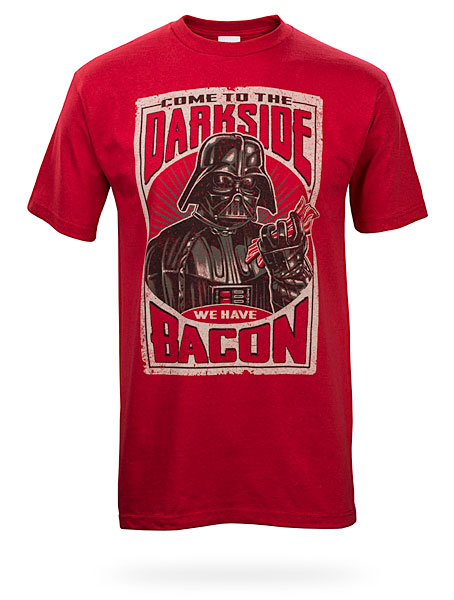 The shirt features Darth Vader with the tempting promise of bacon if you come on over to the darkside. If indeed bacon is the lure that brings young Jedi to the darkside, well then sign me up. No one can resist bacon!