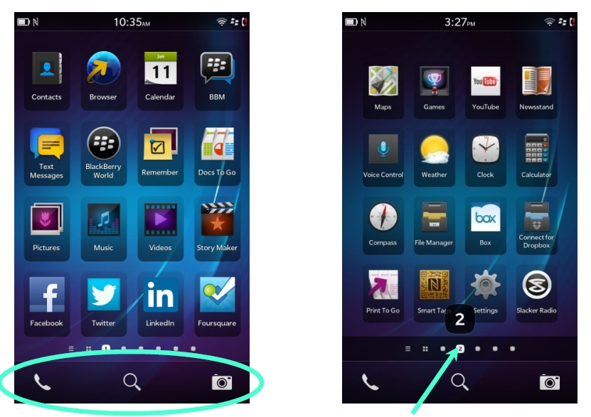 In between the app grid and the bar are a series of tiny indicators that shows exactly where you are in terms of pages. These will be highlighted depending on where you are. You can actually use these to go directly to a specific app page instead of flicking through all the pages. This area also serves to show you if you have apps running in the background. If you do, a little icon called the Active Frame grid will appear just to the left of the little application panels. If there aren’t any apps running, this will not show up. To the far left of this group of icons you’ll see a little 3-lined icon which is for the BlackBerry Hub. This is a very important part of BlackBerry 10 and the Z10.