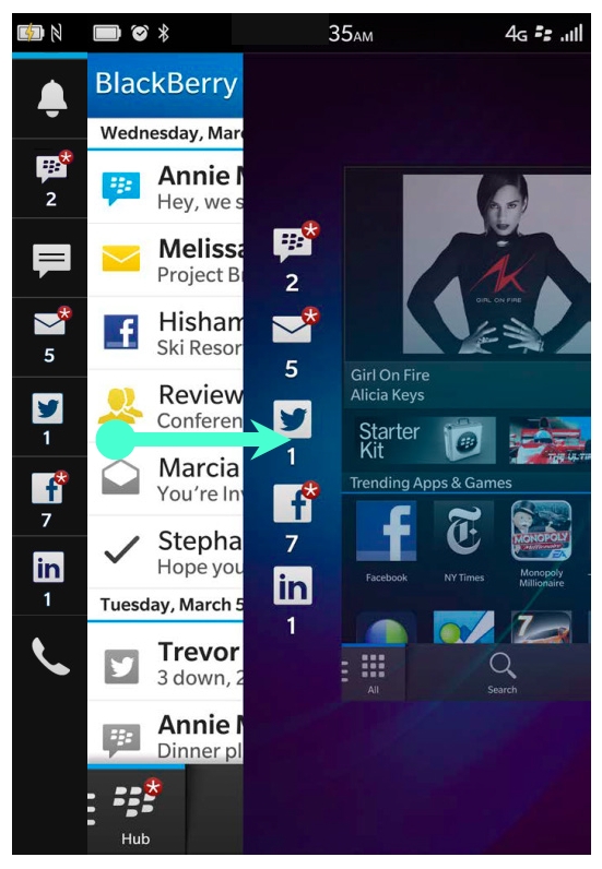 bb_06BlackBerry made the BlackBerry Hub accessible directly from any app or screen you may be on at the time with a simple swipe and you don’t even need to fully go into the Hub to see what appears in there. Let’s say you are browsing the web and all of a sudden, your notification light starts blinking. All you have to do is swipe up from bottom but keep your thumb on the screen still without lifting. The app screen will minimize slightly and to the left of that you’ll find the icon of the corresponding app that the notification came from. If it’s an email, you’ll see the mail icon with the number of emails received. If its multiple items, you’ll see multiple icons. Now you can go even further with this by enabling the peek feature. While still sliding your thumb up, start moving it to the right and you’ll be able to peek inside the BlackBerry Hub and see a preview of each notification. If it’s important and you want to go into the Hub, just let go. If it’s not important, just slide your thumb back left and down and you’ll be back in your original app.