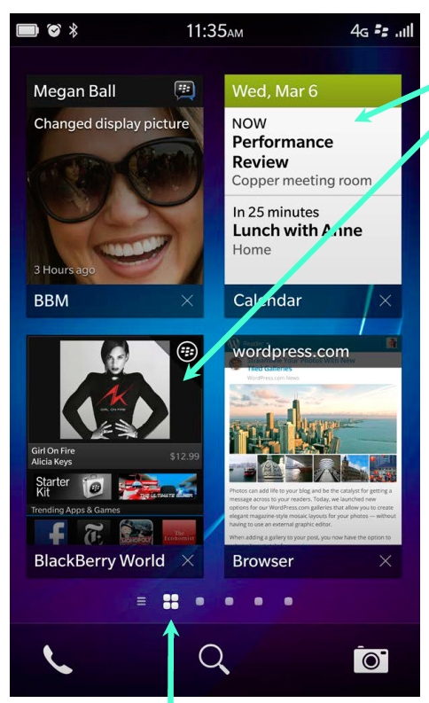 bb_07BlackBerry 10 takes advantage of full multitasking. BlackBerry has always been known for multitasking and the Z10 just makes it better. BlackBerry 10 introduces something new called Active Frames. Let’s say you are in an app like Facebook for instance and need to get to the browser. Swipe up in Facebook to exit and minimize the app. That will put it on he Active Frames page. Next go to the app grid and open up the browser. Now that the browser is open, let’s say I Want to get back to Facebook. Just swipe up on the browser and it too will minimize and become a tile on the Active Frame page. On this page, you should also see Facebook still running as a tile. Tap on this and Facebook opens back up.