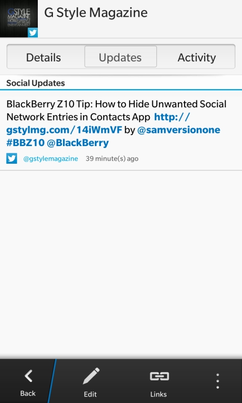 Another app I’m going to highlight is the contacts app. Because this is a BlackBerry, I’m sure this is an app most people will make use of to keep track of family, friends, and business associates. This isn’t a standard contacts app however. It goes beyond just storing information you’ve collected. It’s a socially connected contacts app that will pull down information about your contacts from sources like Facebook, LinkedIn, Twitter, and Foursquare and keep them updated so you don’t have to.