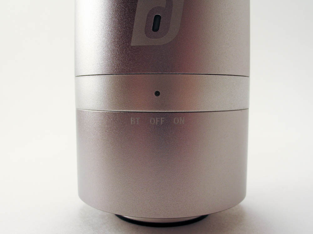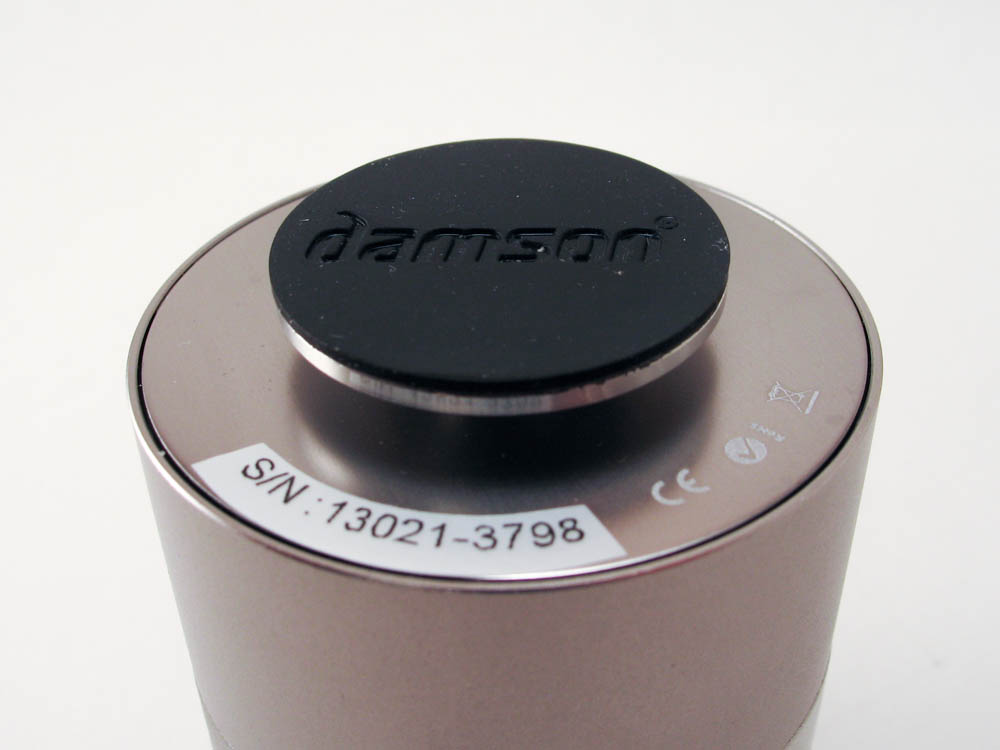 For starters, the Damson Twist just looks like your typical can shaped Bluetooth speaker. It’s a small at only about 2.75-inches tall and about 2.25-inches in diameter. What catches your attention though when looking at its sleek aluminum body is you begin to wonder where the actual speaker is at because there isn’t one in the traditional sense. Nothing on the body looks like a speaker and you don’t see any speaker grills that usually give away its position. Instead all your see is a clean, cylindrical aluminum body with a black, mirror like circle up top.