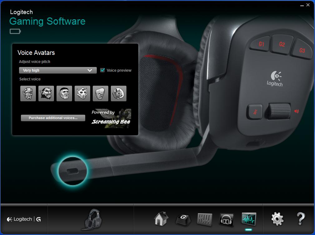 The last settings screen is for voice masking. Logitech calls this Voice Avatars. Here you’ll be able to mask your voice to sound like any number of preinstalled profiles. The software can make you sound like a robot, and alien, or even a hamster. You can even adjust the pitch of each profile. If that’s not enough, you can also purchase additional voice profiles online to use.