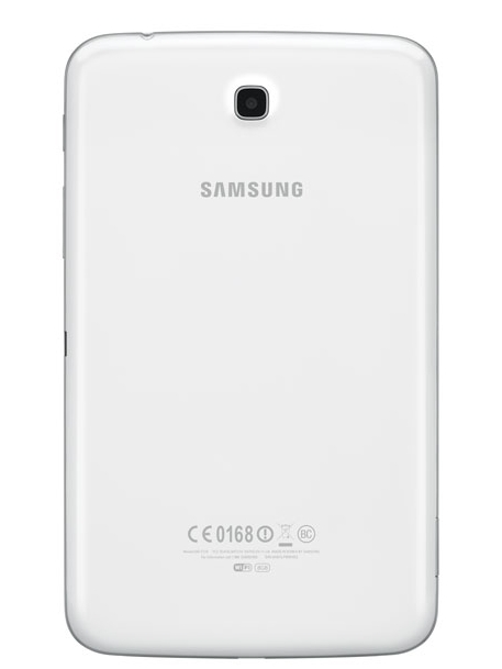 The rear of the Galaxy Tab 3 like I stated before is made of polycarbonate plastic. Unlike the Galaxy S4, the rear panel, it doesn’t have that diamond looking weave on it and is instead a solid white color. I forgot to mention that the front bezel is like this too and is also solid white. On the back, you’ll also find the rear camera which is a 3.0MP unit which is a bit low considering the iPad Mini has a 5.0MP unit. It also lacks an LED flash, but that’s not surprising for a tablet as most don’t have one either.