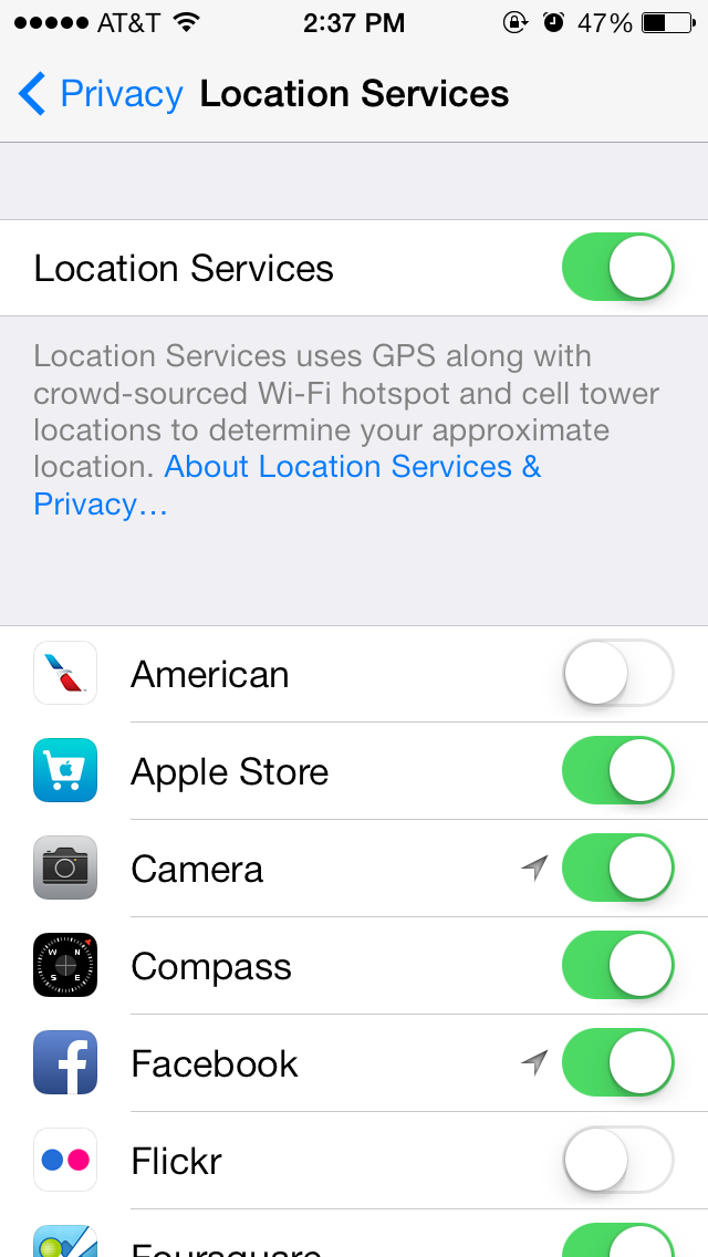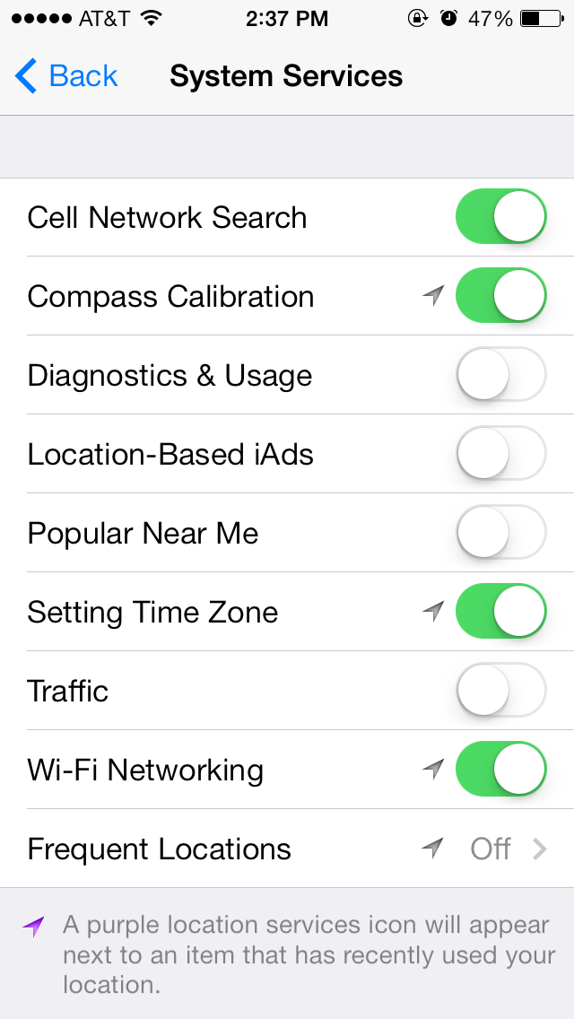 6. Under Location Services, scroll down and enter the System Services section of that page. There are a bunch of things here you can turn off that are not necessary. I myself have Diagnostics & Usage, Location-Based iAds, Popular Near Me, Traffic, and Frequent Locations all turned off.