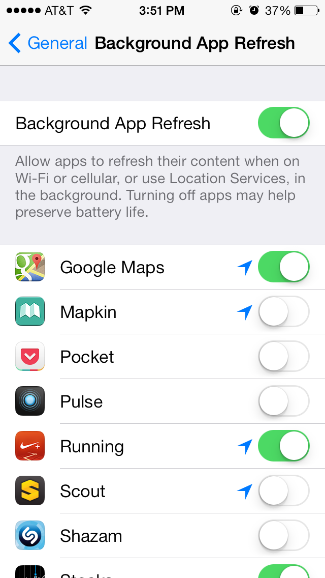 8. Disable Background App Refresh or portions of it. This can be found under General > Settings. This is a new feature in iOS7 and allows apps to grab content in the background, even when not in use. That means certain apps will always be accessing data and causing slight battery drain. I suggest either turning it off or turning it off for certain apps.