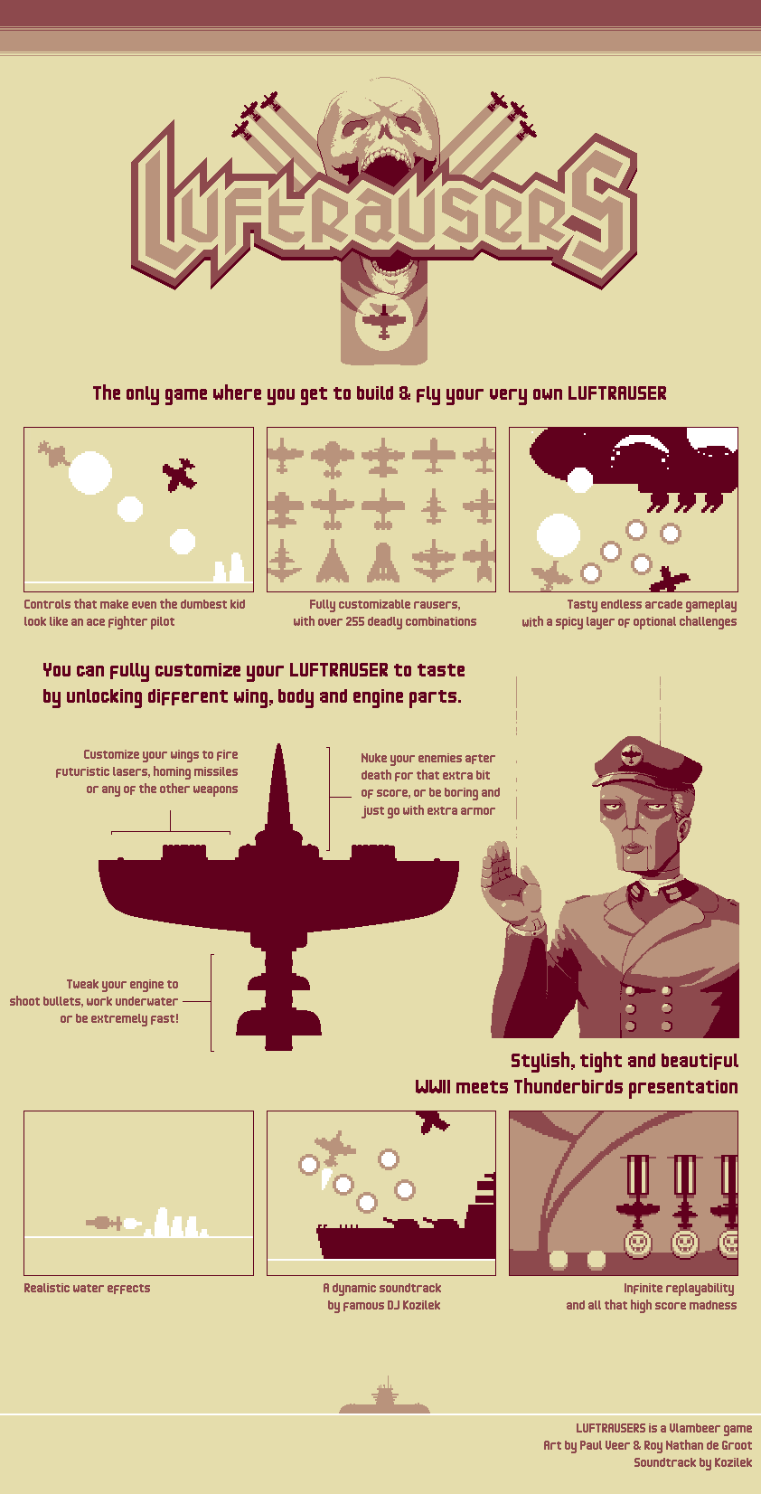 However in my opinion, LUFTRAUSER looks amazing for the type of game it is and even among retro 8-bit looking games, has an art style all its own. The game uses very a very limited color pallet that has that sepia feel to it that you see in old photos. This gives the game a really unique look, adding to its war themed look. I’d say that it’s the look of the game that really caught my attention and was one of the main attributes about it that I really like.