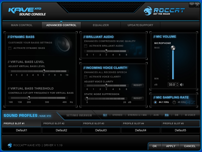The next tab is the Advanced Control tab that is used to adjust features you probably normally wouldn’t touch. As you can see from the screenshot, you can control aspects of the bass output. Here you can also adjust the clarity of voice chat as well as your mic volume.