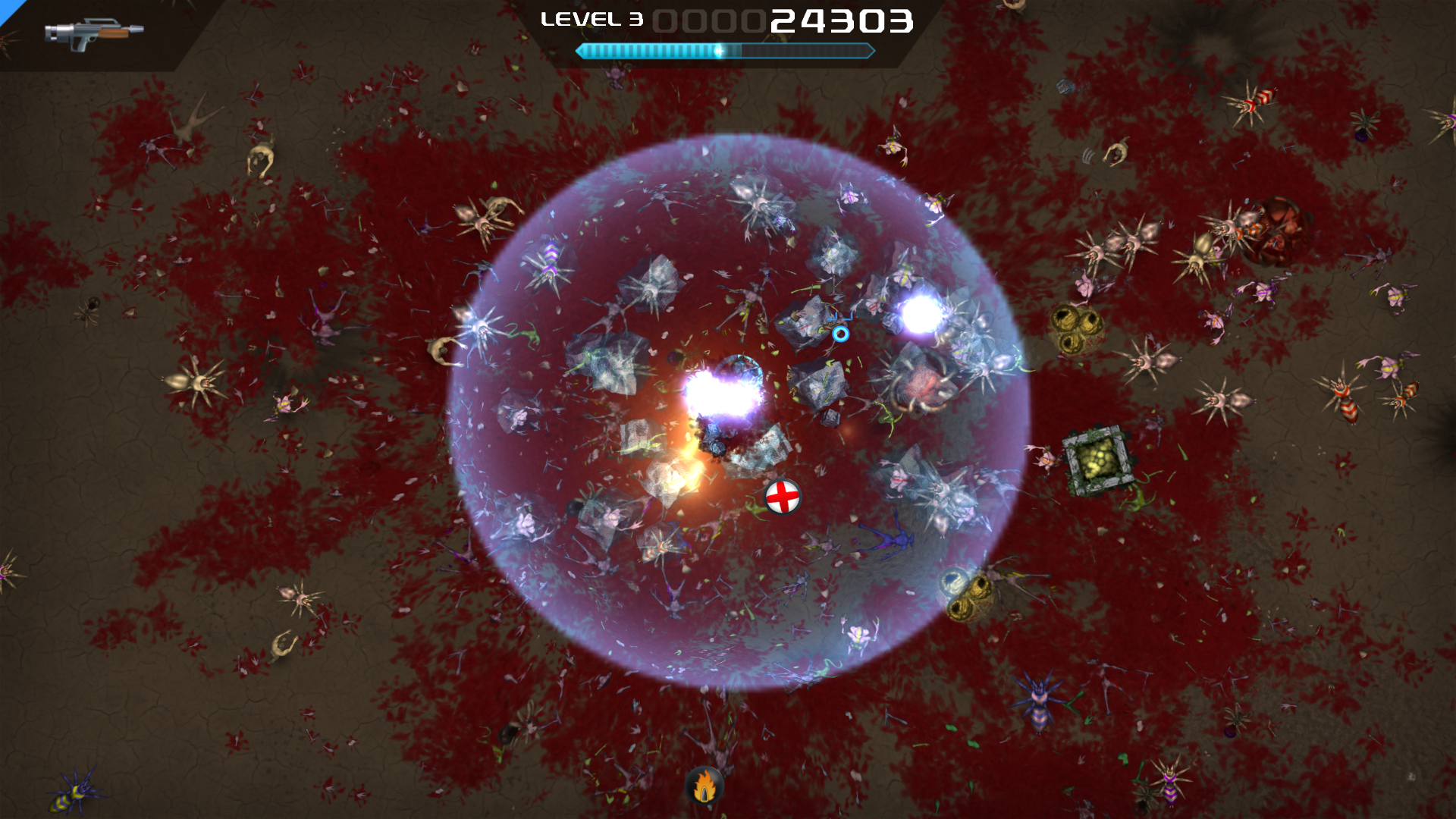 The arena itself is pretty barren with not much on it and it only gets filled when there is blood splattered about everywhere. The character models look pretty good though, considering you only see them from the top down, but they look good. The special effects and animations look good to, like all the explosions and weapon effects, I just wish the backdrop wasn’t as barren as it is. Crimsonland on PS Vita is still pushing a ton of baddies on the screen at once without a single hiccup. The game runs super smooth even with what seems like hundreds of bad guys at once on the screen.