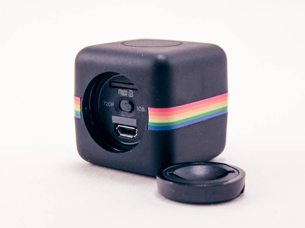 On the back of the Cube is a slotted disc that is impossible to take off using your bare finger. You have to use a small coin, like a penny or a dime to twist it off. The plastic disc that comes off has a rubber portion on the bottom of it that forms a seal with the opening so that water does not leak into the device. Underneath the disc once you take it off is where the SD card slot is as well as the USB charge/sync port. There is also a switch for telling the Polaroid Cube whether to record in 720 or 1080 mode for video.