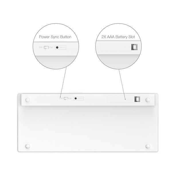 The rear of the keyboard isn’t as nicely done up as the front is and is just in a matte white. It’s also not quite as sleek as it is up front either. The Inateck BK1002E runs off of two AAA batteries meaning it’s not rechargeable so you’ll need to replace batteries over time. On the plus side, the keyboard is supposed to last around 60 days and if the keyboard does run out of charge, you can pop in some fresh batteries and continue working without having to wait for a recharge.