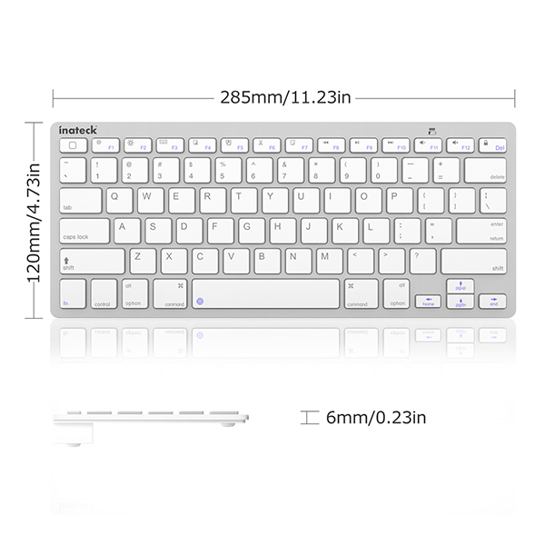 The Inateck BK1002E is a rather nice looking portable keyboard. It’s based largely on Apple’s own official wireless keyboard, but for a small fraction of the price. This is because unlike the Apple keyboard, the Inateck BK1002E is made entirely of plastic. The face however is painted in silver and gives it an identical look to brushed aluminum. The keys themselves are in matte white. That means the Inateck BK1002E looks almost identical at quick glance to that of the official Apple Wireless Keyboard, though you’ll notice the difference once you get close up.