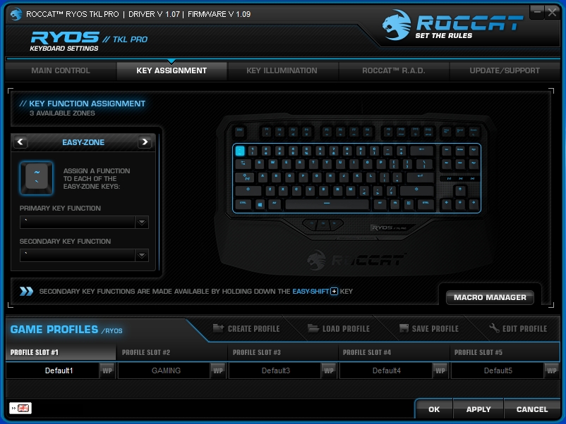 The Key Assignment tab is really the meat and potatoes of the Roccat software. Here is where all the advanced features are. From this tab, you can assign the secondary function of every key on the keyboard. This might not be all that helpful when just using regular apps but with games, you can assign keys to do anything you want. Mainly you can assign these keys to run powerful preloaded macros or custom macros you create. Macros of course are just complicated set of commands assigned to 1 key so that you only have to use the one key to run them instead of inputting those commands each time. The secondary commands can be activated if you set the Easy-Shift to function properly.