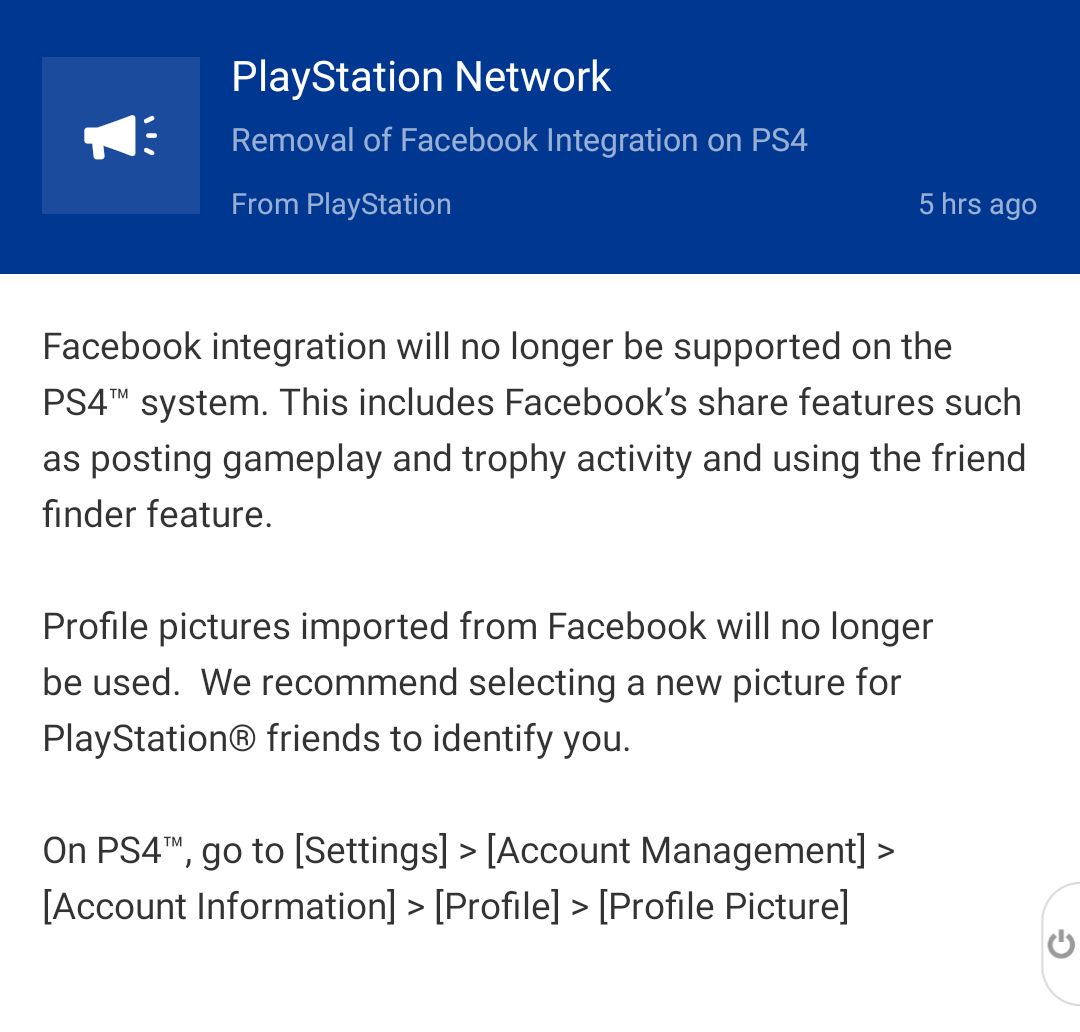 Some of you might have woken up this morning to a PlayStation Network notification if you have the PlayStation app installed on your smartphone. This notification states that the Playstation 4 will no longer support integration with Facebook. This includes Facebook’s share features such as posting gameplay and trophy activity and using the friend finder feature.